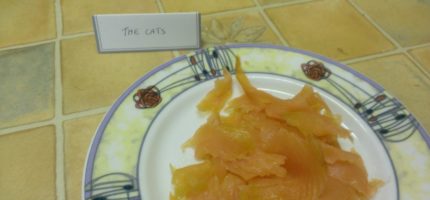 Last year the crackers came with some name markers. I thought the cats might like their own – so this was their plate of smoked salmon. This was after they had finished their smoked salmon (I say “their” but Tora is actually not that fond of it).