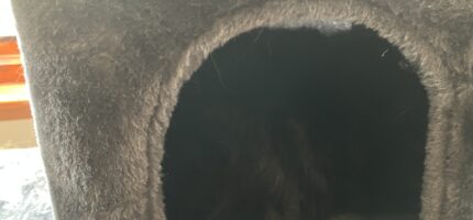 Lucky now spends a lot of his time in the cat tree in the lounge. He is invisible here… Until he moves slightly and shows one white toe. He has one white toe on two of his paws, one white toe on another and one white whisker.