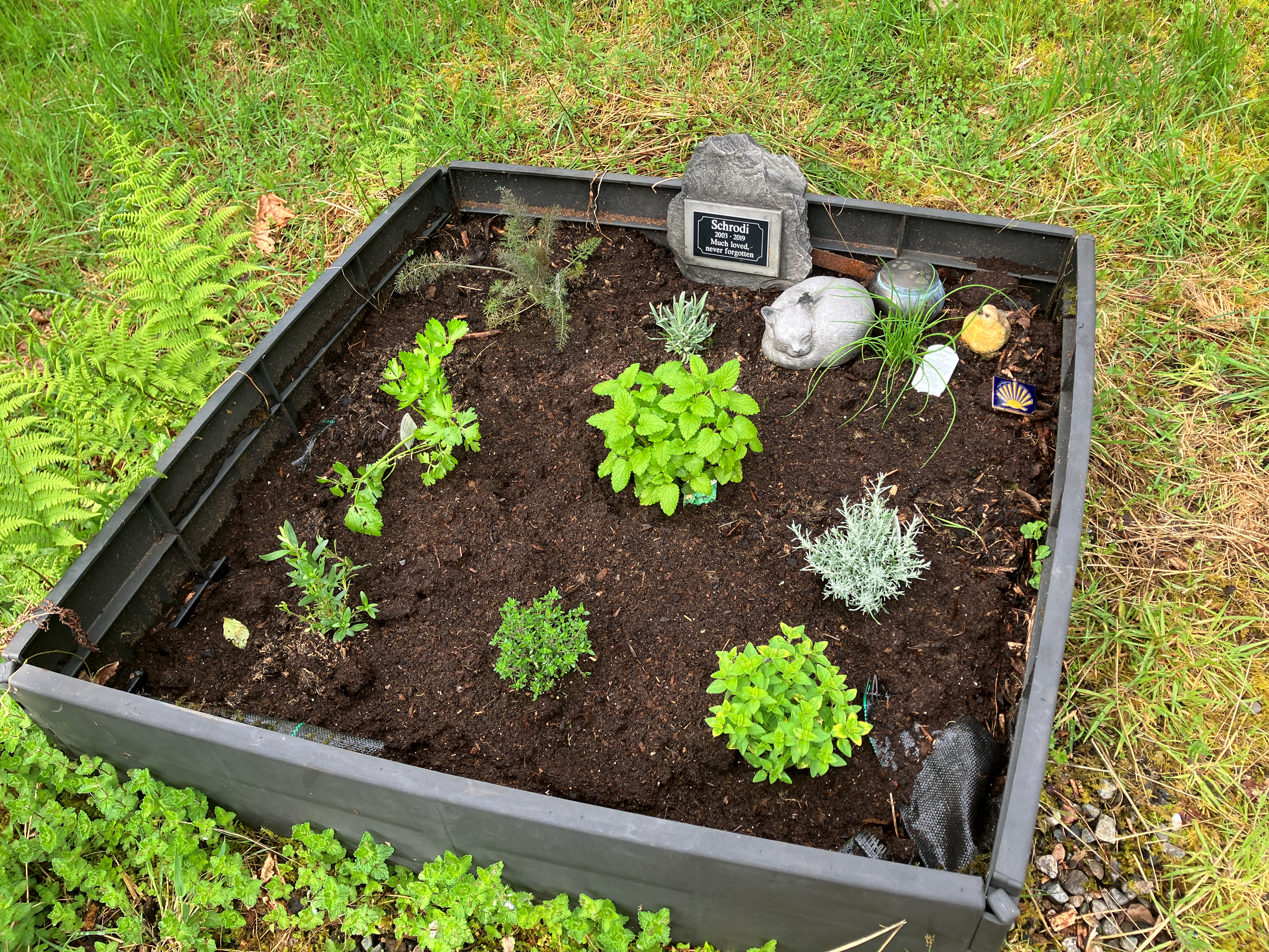 J and I dug out the old raised garden. This was set up in remembrance of Schrodi. J did the digging and I did the planting. After a miserable failure in planting out herbs from seed, I ordered some grown seedlings and they seem to be doing ok so far. We have a nice variety […]