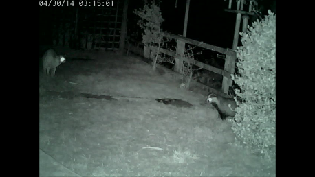 I caught this little encounter (click image above for video) on the webcam from last night. Obviously the badger is not phased out by its meeting with Schrodi, and Schrodi (whilst clearly not thrilled) is not terrified either.