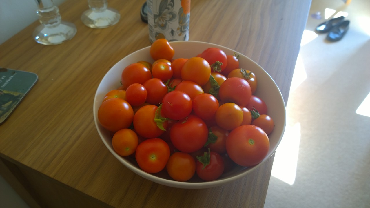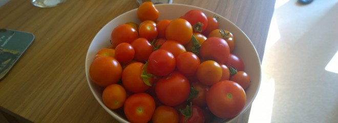 We now have a seriously large number of tomatoes getting ready every day. They are lovely and flavoursome and sweet – actually much better than even the expensive vine tomatoes from M&S or Waitrose (or even Lidl!). R will not eat tomatoes unless they are cooked – but these ones are actually nicest just eaten […]