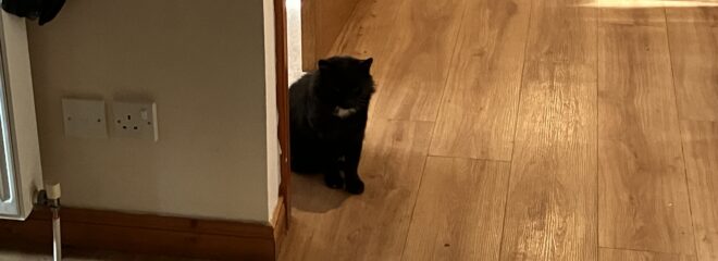 So I activated my plan, which was not approved by R for fear of injury to both of us. I put on a pair of thick gardening gloves, and while she was cowering in a corner, I grabbed her and scruffed her. R muffled a towel round her, and we stuffed her into the trap. Then he drove her to the vet in Dunoon.