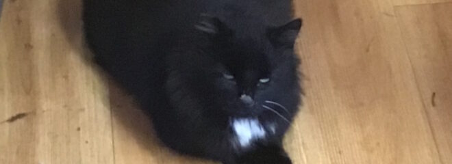 He annoys me by weaving about under foot when I am trying to prepare meals and clean the kitchen, and annoys the ladies by insisting on sleeping right in the door of the kitchen where he is between them and the cat flap.