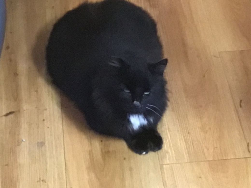 Here he is in the kitchen doorway – not great resolution as taken on my old iPod which I use for audio books while cooking. His nose is not really that colour – it is just covered with some of the cat food he has just guzzled down.