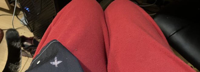 So as I am on cat duty this morning, R recommended wearing a thick pair of trousers to avoid clawage. Here are my red trousers which normally pass for best and are moderately swipe proof. If you look closely at the extreme left of the picture you may see a tail. This belongs to Saphy, who is now engaged in a spider hunt along the edge of the french windows in my office.