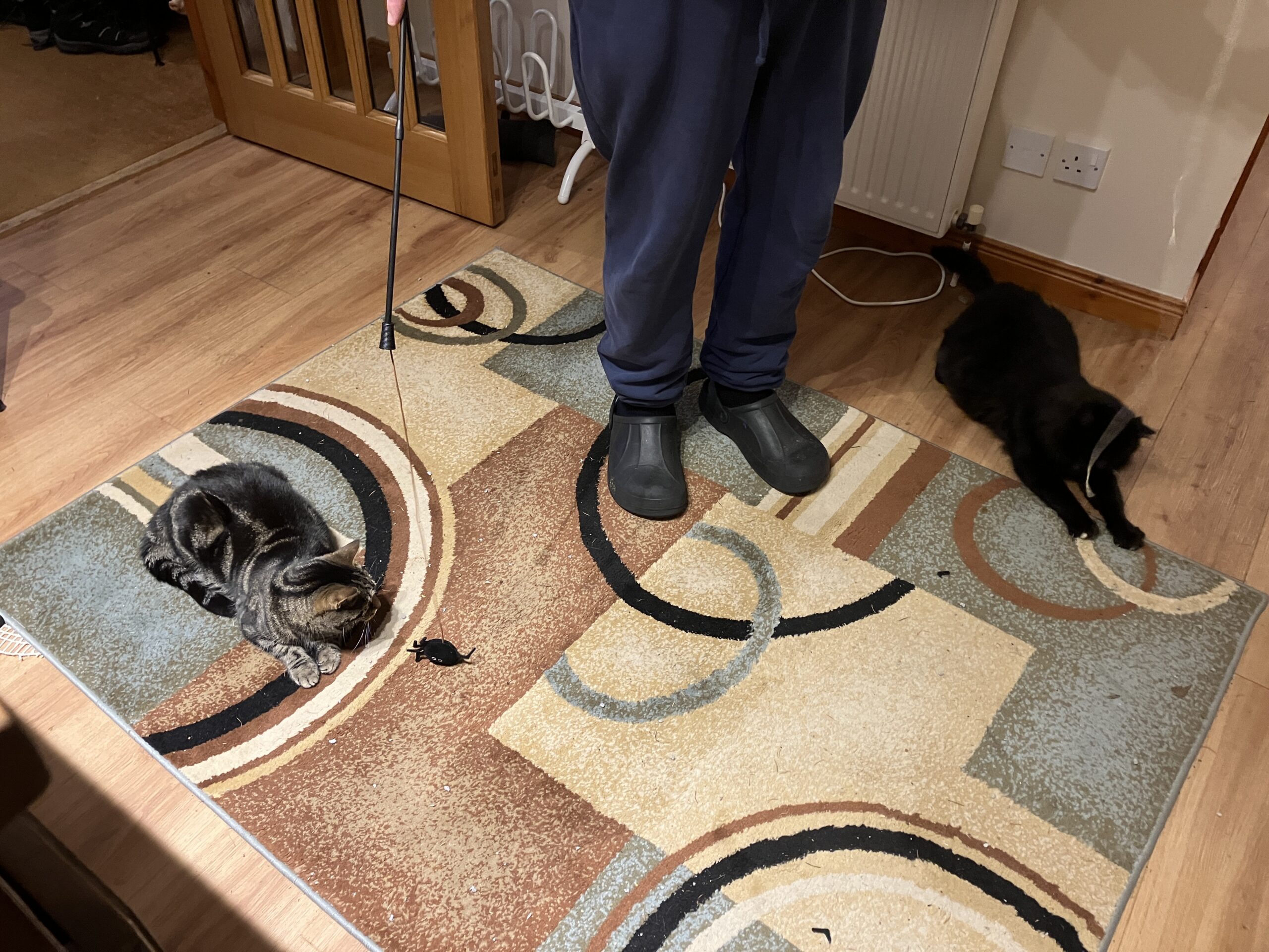 But yesterday we were putting the Christmas tree up, and there were sundry pieces of string and tinsel lying around. Obviously this was cat heaven for Saphy and R played with her with a bit of string for five minutes or so, with Lucky watching intensely. Suddenly he started to play with the other end of the string.