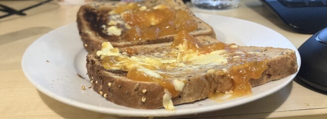 But buttering toast had me beat until today when I worked it out. Soften butter at 50% power in microwave for 20 seconds, Place toast on chair below waist level. Hold steady with right hand without lifting arm and spread butter with left hand. Jam easy enough to add with spoon. Sorted.