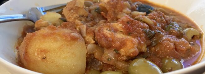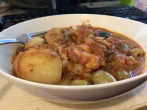 While this is happening, peel and parboil some potatoes and after they have been cooking for around 8 minutes drain them and add them to the fish. Stir the mixture but not too hard or you will break the potatoes up. Pour everything into a large slow cooker and put on the four hour programme. 20 minutes before the end of the cooking time, add half a jar old drained olives.