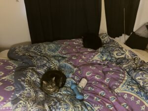 This is the Ladies hiding from him on my bed. Apart from the time where he panicked when we were trying to catch him for the vet, Lucky has not been known to jump up on to furniture, so hopefully he will not get the idea and the “upper layer” of the furniture will remain a female refuge place.