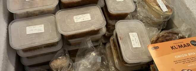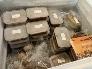 I’ve now made most of them, many using my new friend the slow cooker. Here they are – 66 of them so far, plus 52 home baked rolls. As can be seen, I moved all the day to day food out of the main chest freezer into the other two, in order to dedicate the space to the stock pile.