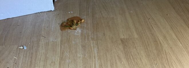 She tried really, really hard to make it to the bedspread, but she just couldn’t get there and had to be sick on the wooden floor instead.