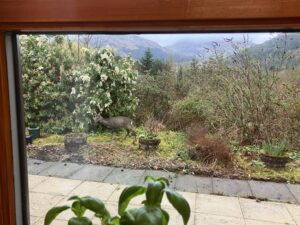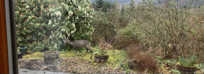 I’ve really missed seeing the deer in our garden. We used to get them all the time – but I haven’t seen them here in the last two years (although R saw one a few weeks ago). This morning I was filling the kettle and looked out of the window to see a face looking in.