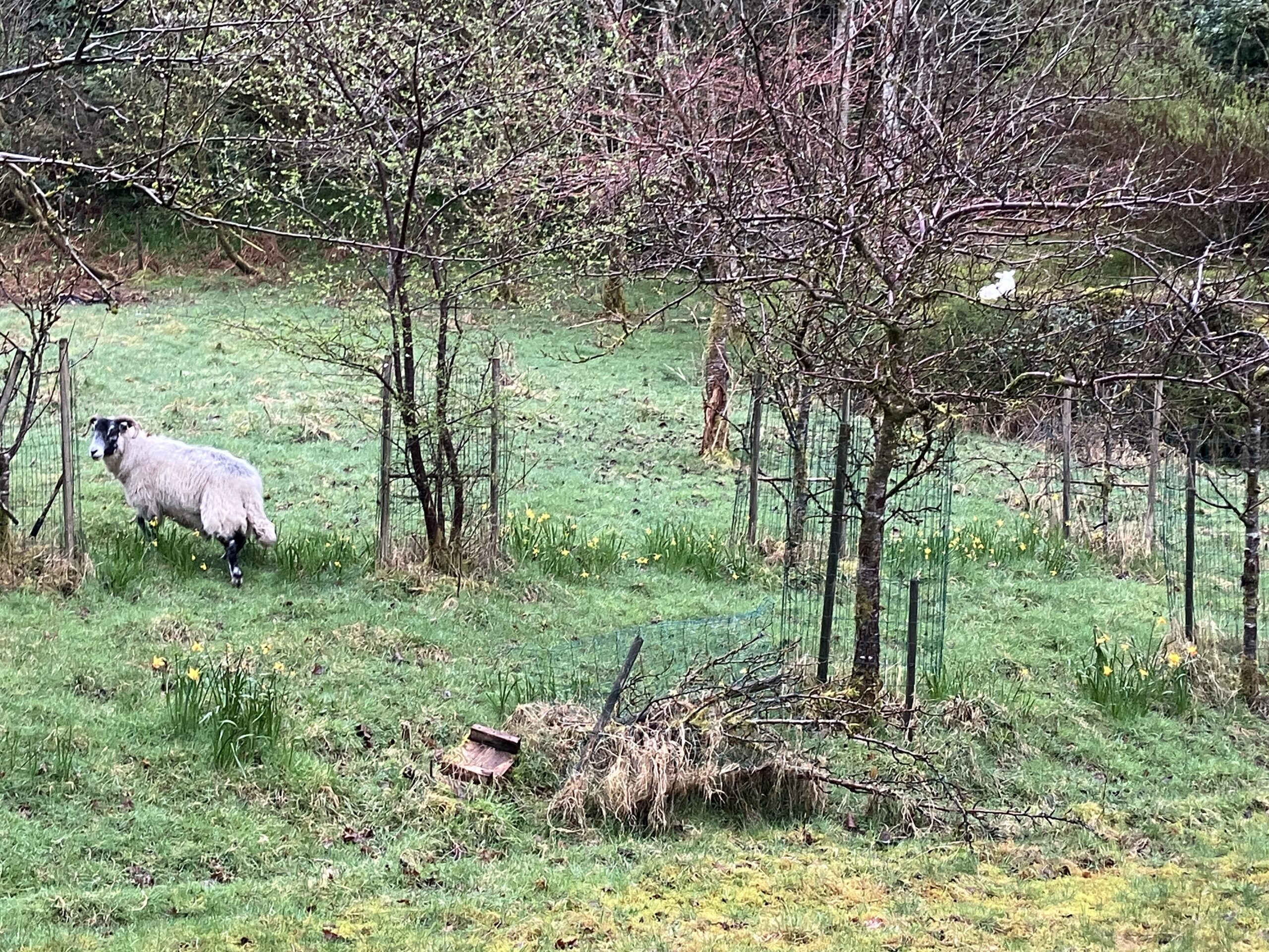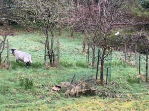 Our sheep are also still with us – Mum right outside the back door and lamb right on top of the ruined wall of the old cottage.