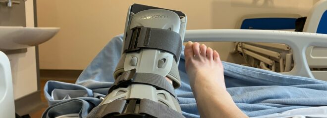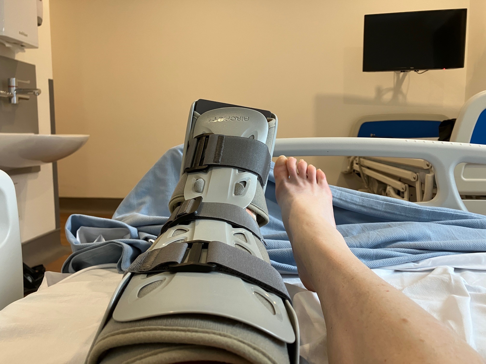 My leg is encased to the knee in an enormous space boot. I had a nerve block so I can feel nothing down there at the moment.