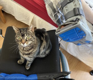 Luckily I have one cat (Saphy) to keep me company (and steal the wheelchair!). The other two have deserted to R who is now sole custodian of the fridge…
