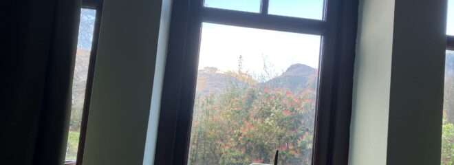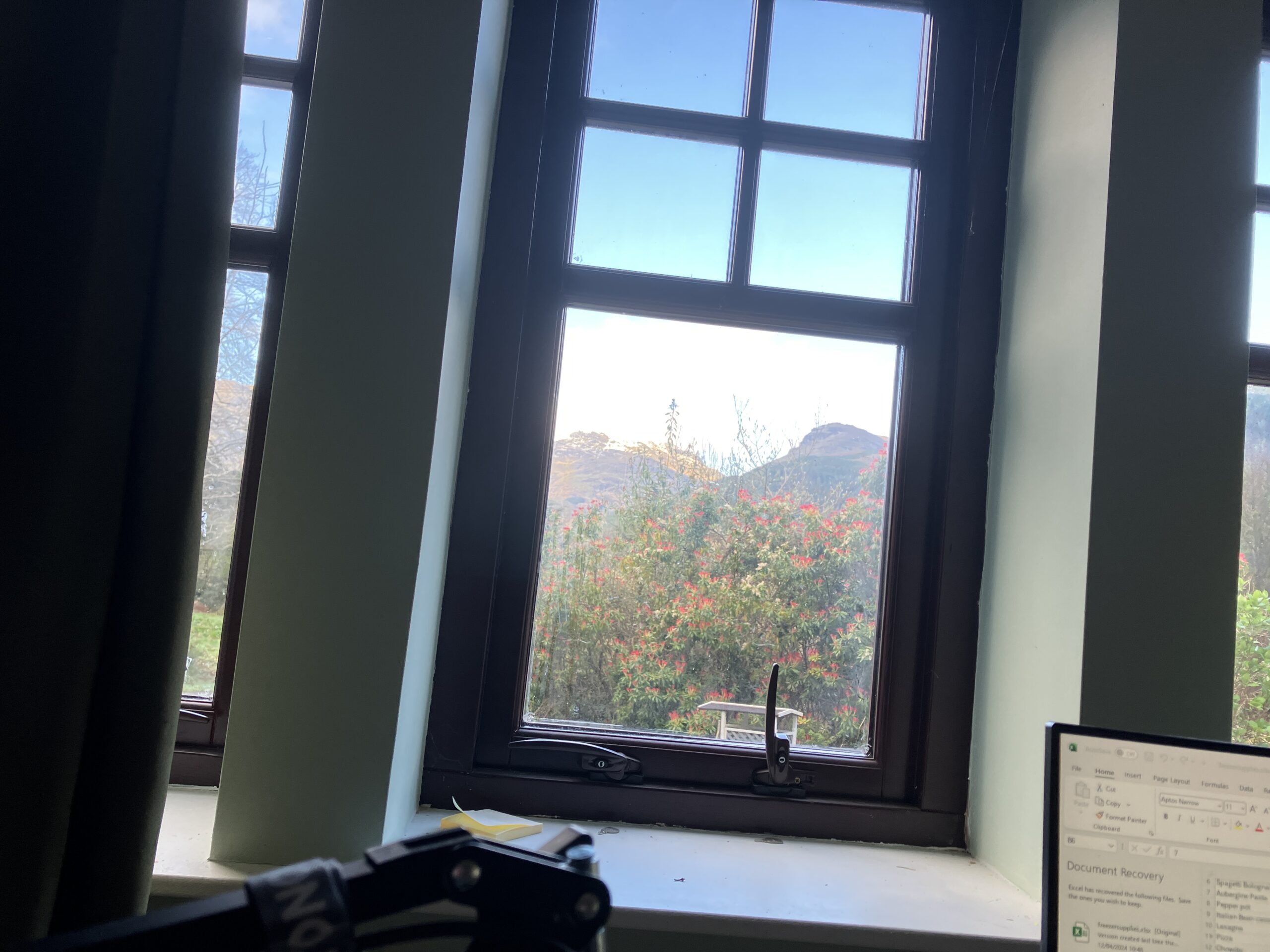 Feeling a bit sad today as the weather is lovely and I can see the snow covered mountains out of the window of my office but can’t go outside as it is a choice of steps with crutches which I am not prepared to undertake until I can put some weight on my foot, or a very steep wheelchair ramp. I have already done the latter with R’s help, but I as at the bottom of the ramp there is a 70m steep slope down to a fast flowing river, I am not prepared to try it on my own in case I end up as front page news on the Dunoon Observer!