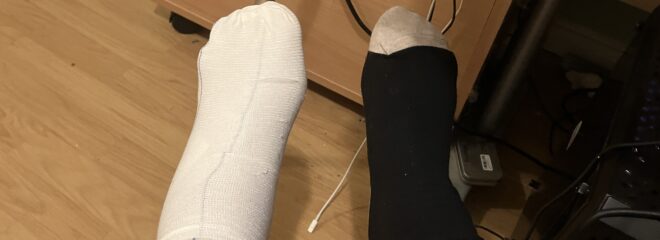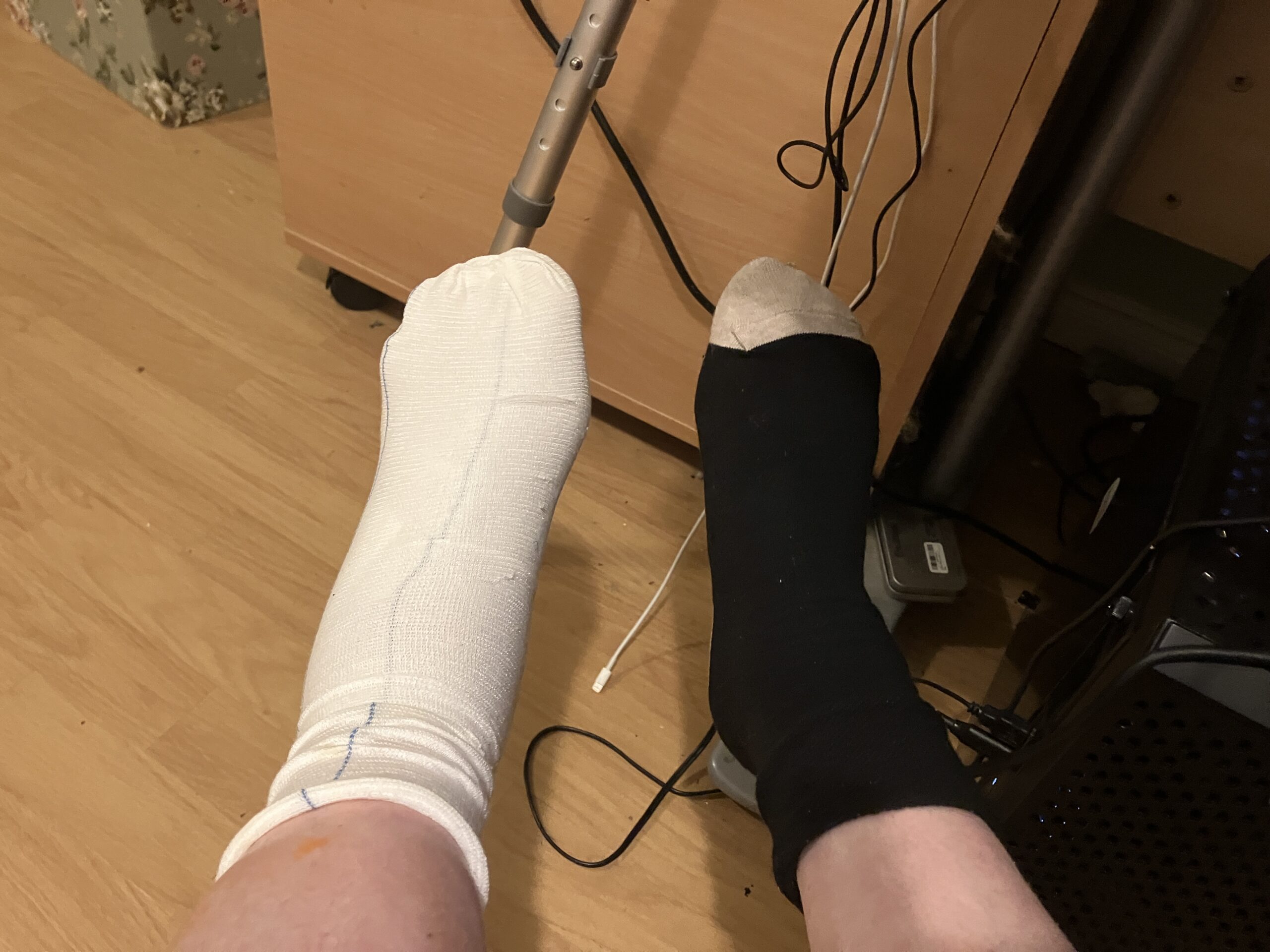 My foot is a bit sore (not terribly sore) when I put weight on it, so I am building up gradually and still using the wheelchair for longer distances (our hall is 15m long which doesn’t sound much, but I can assure you is quite a challenge without being able to put any weight on one leg!).
