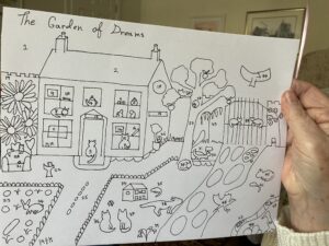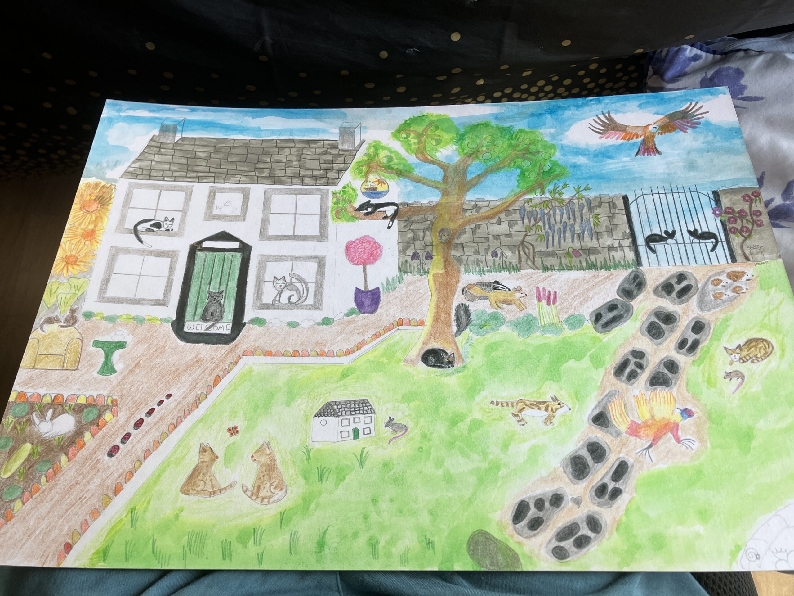 I painted my Mum a picture “The Garden of Dreams” which is basically an idealized version of the last house she lived in with Dad, complete with all the pets our family has had over the years, and many wild creatures. Unfortunately this photo was taken before it was finished – I forgot to do one of the finished version before I put it in the frame.