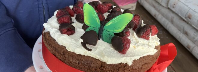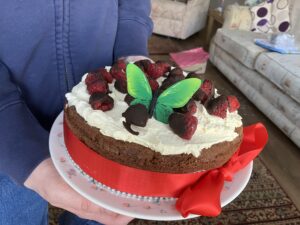 We had wild mushroom soup, luxury fish pie and a birthday cake. I’d cooked all of this before the operation, but put the cream and raspberries on the cake this morning. R had to do all the putting in and taking out of the oven, plus serving.