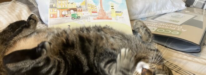 I think one of the cats (I am still blaming Saphy) had at least three rodents yesterday. The picture is of her chilling after her big day with an abortive picture of Victorian Helensburgh I was trying to paint.