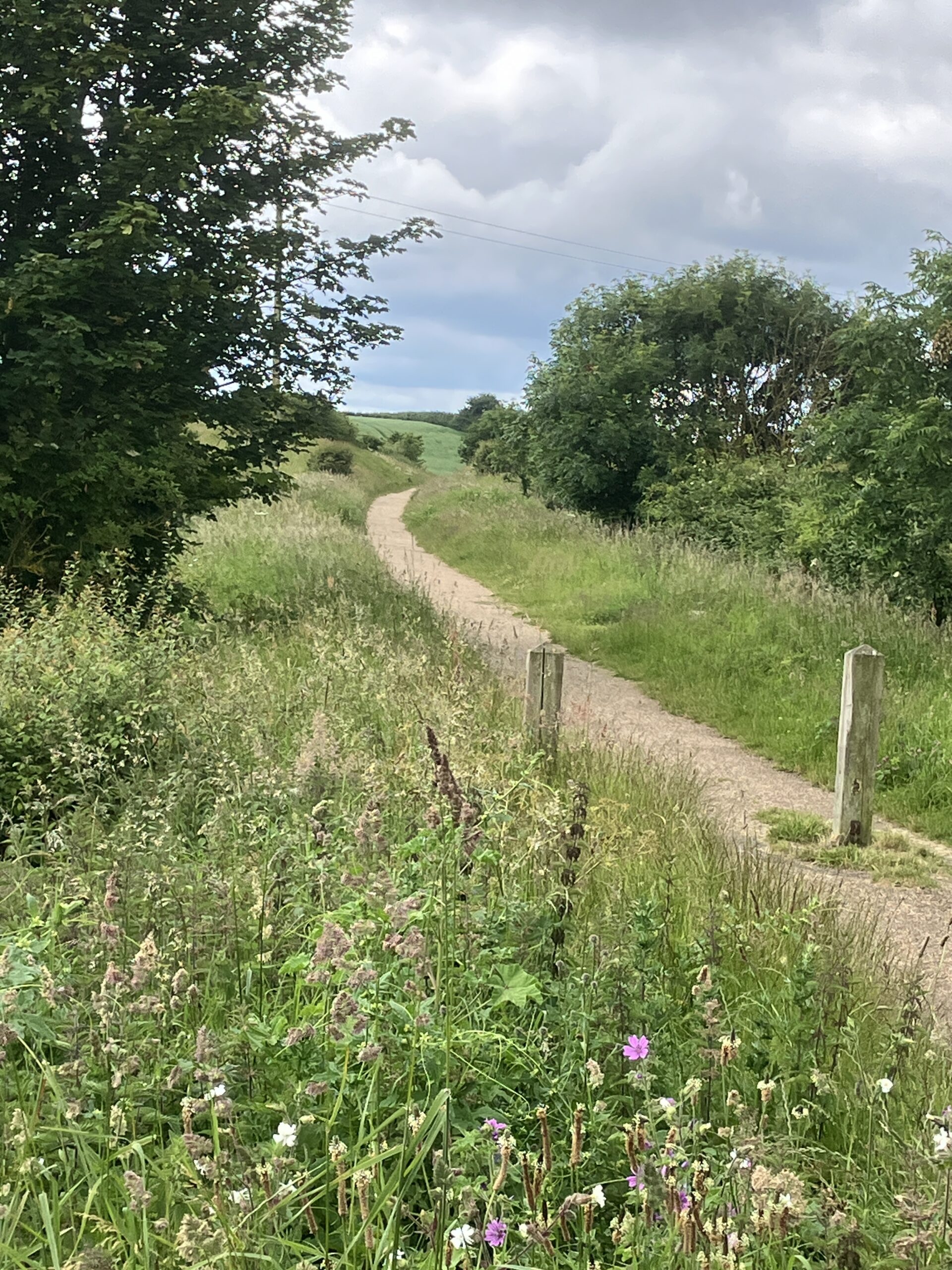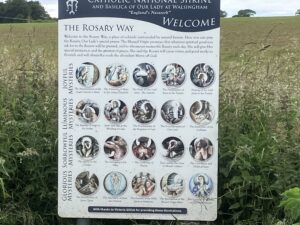 Today J and I walked down the Holy Mile between the Slipper Chapel where the RC shrine now is, and the Anglican shrine in the village. This is by far the longest walk I’ve done since the operation. Walsingham is much better than Lochgoilhead for my foot because it is nearly all on the flat and not rough under foot. The path to the shrine is down what used to be an old railway line to Fakenham, and in fact the continuation of the path is still a real working railway (the Walsingham to Well preserved steam rail way).