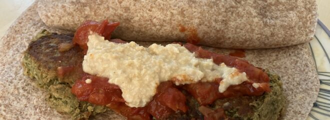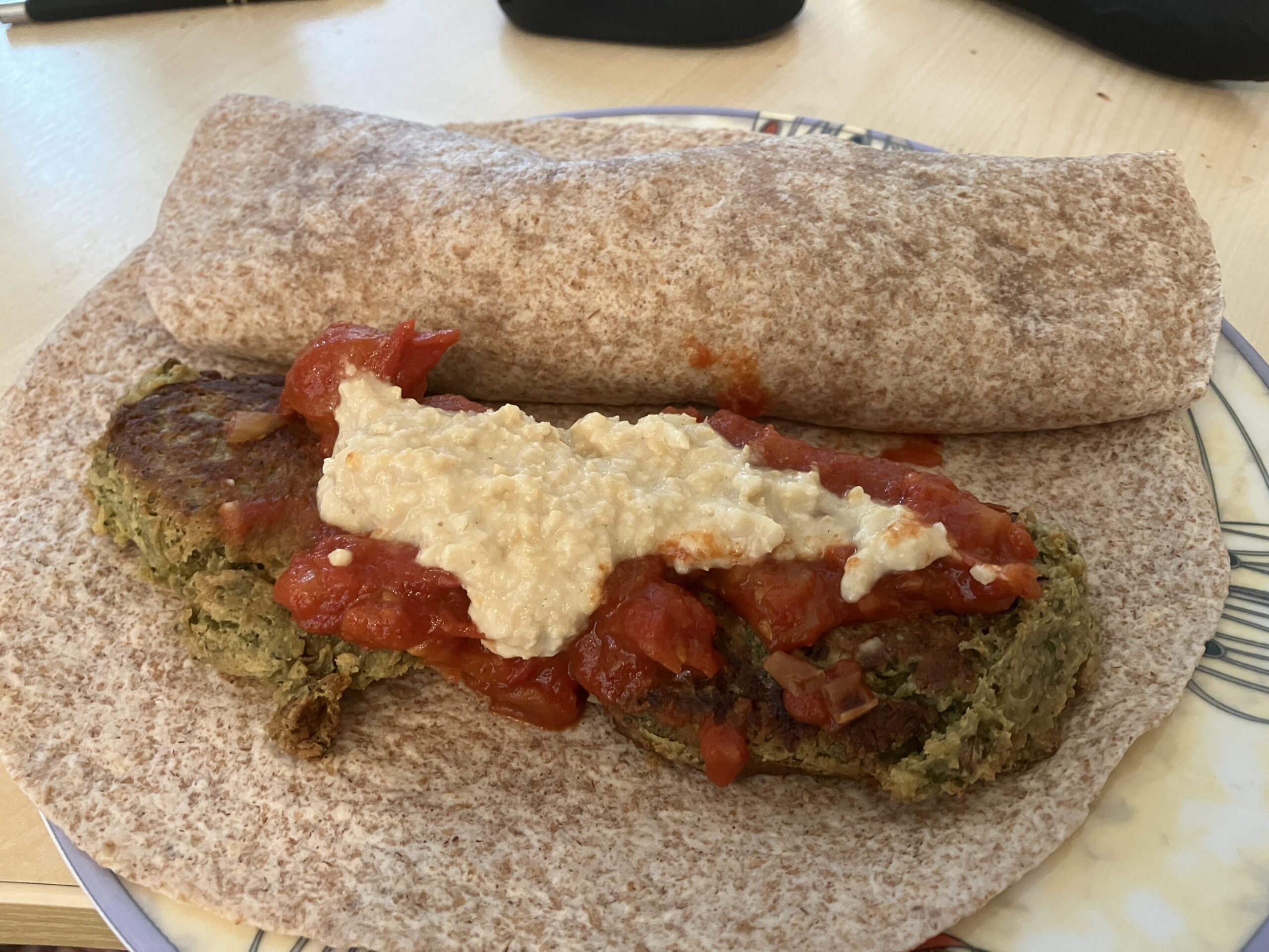 So I made homemade falafels (chick peas, organic tahini, olive oil garlic, organic wholemeal flour, coriander), humus (same plus garlic and minus flour) with homemade hot salsa, olives, fresh tomatoes and homemade flatbreads (organic wholemeal flour, water, yeast, salt). Served with natural yoghurt (ingredients – milk).