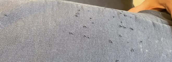 Basically, whenever R is around the kitchen, Lucky grabs him by the trouser leg and gives it a good chew. At first, we thought that this was him trying to pull R to the food bowl, but that does not actually seem to be the case, so we think it might be a gesture of affection. Goodness know why just this one specific pair of trousers though, because he isn’t interested in any others, not even if it is R wearing them.