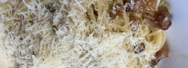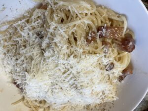 My “carbonara” contains onions, garlic, mushrooms, eggs, unsmoked bacon, black pepper and parmesan cheese. Lightly fry the onion and garlic in olive oil, add the mushrooms and cook until soft. Meanwhile grill the bacon until crispy and chop into small pieces. Boil the spaghetti for 10 minutes. Whisk four egg yolks and a small carton of single cream in a bowl. Drain the spaghetti and mix in the onion/mushroom mixture. Turn the heat down, stir a bit and then pour the egg mixture over stirring all the time. Serve with parmesan cheese.