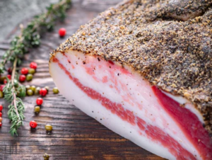 This is the Italian recipe we tried. Chop a smoked pig cheek (guanciale) into small pieces and fry in a small pan until crisp.