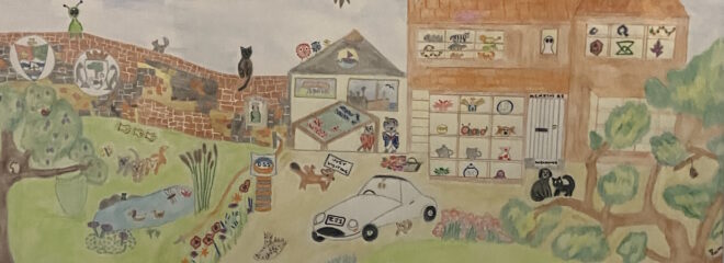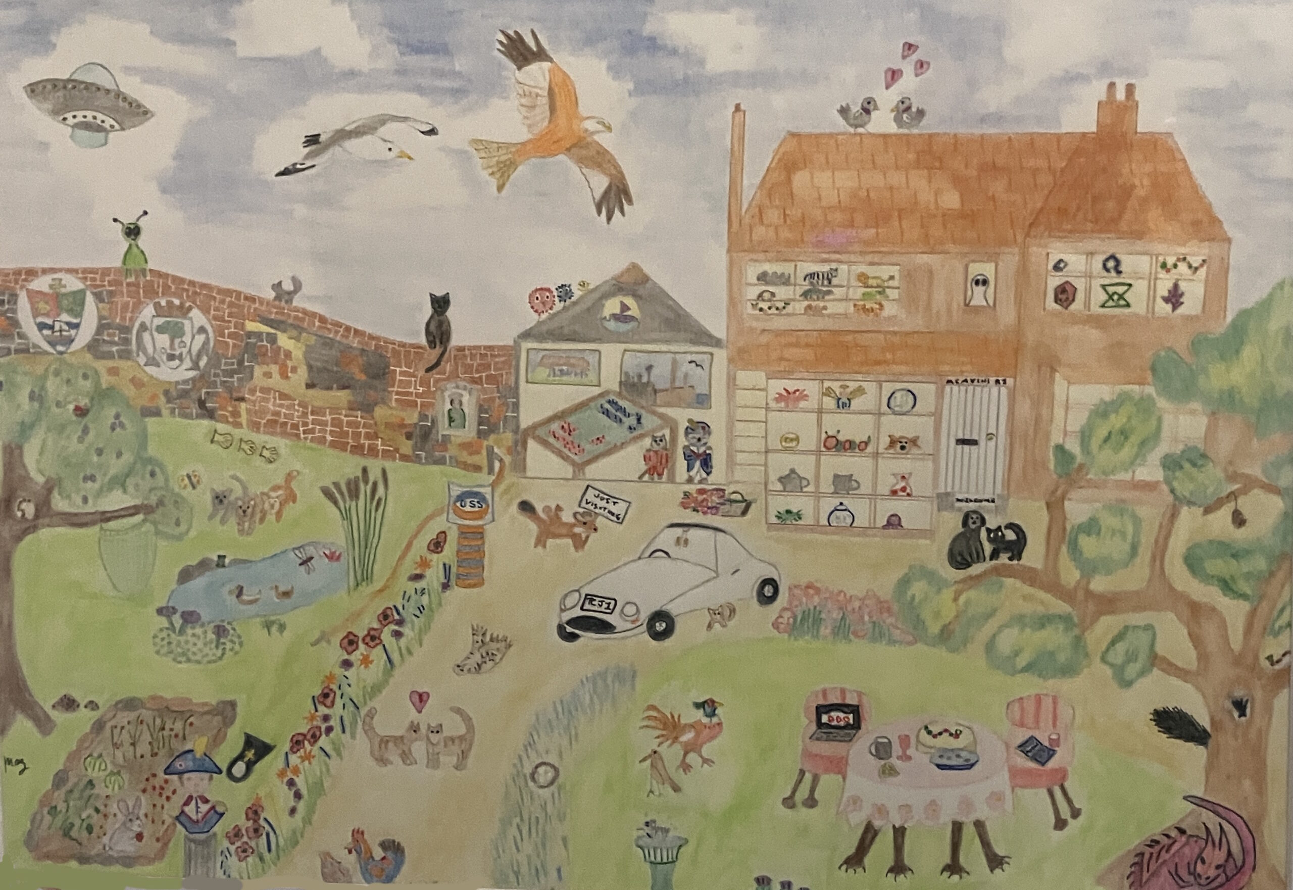 It is based on the house in Norfolk which is currently in the process of being sold, and all the other things in the picture represent things that have been important in his life. The total absence of people means nothing more than the fact that I am useless at drawing people.