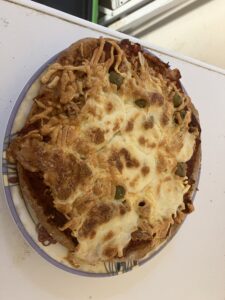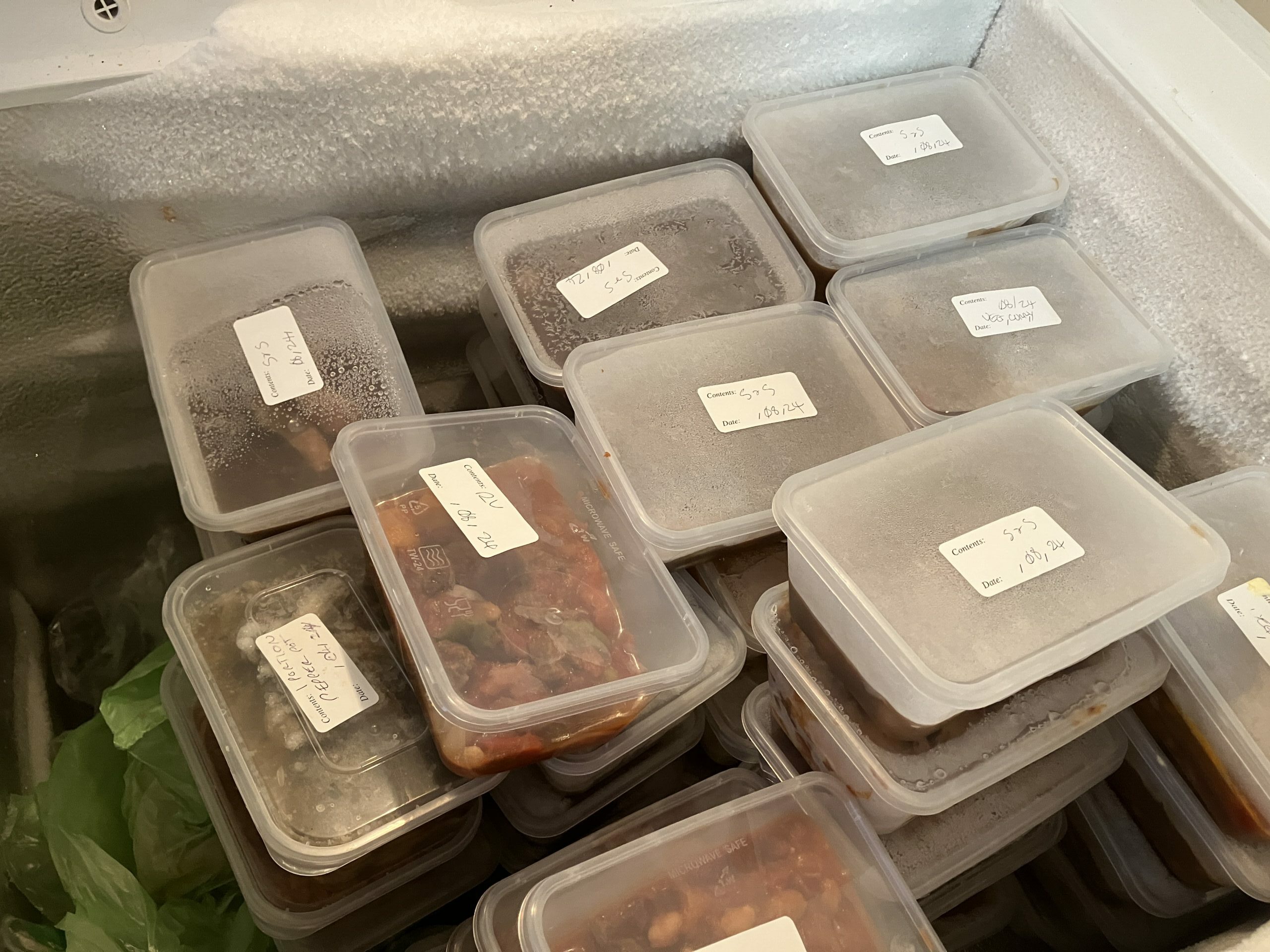 So I am going to give myself a big hand of applause as under these circumstances and with a sore foot, I have managed to make 60 portions of food. We have chili con carne, chickpea and cauliflower curry, fish casserole, ropa vieja (Columbian beef stew), pepper pot, vegetarian lasagne, chowder and dhal. We have steak and sausage pie, falafels, broccoli cheese and shepherds’ pie. Also pizzas (made from scratch with home made bread dough and home made tomato sauce – the cheese came from ASDA. We also have 24 assorted bread rolls, 2 loaves (sliced into portions for toast and sandwiches) and 6 naan breads.