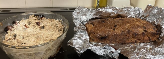 Then I had some surplus bananas so I made a banana bread. I mashed up some (there were five small ones) bananas, added two eggs and 110ml sunflower oil and whisked it all together. I added 150g demerara sugar and 200g plain flour and 2 tsp baking powder. I mixed again, put in a lined loaf tin and baked in the same oven for around 60 minutes.