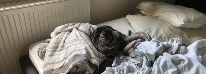 I washed R’s sheets and towels while he was away and put clean ones down on the stripped bed for ten minutes before coming back with the intention of making the bed.