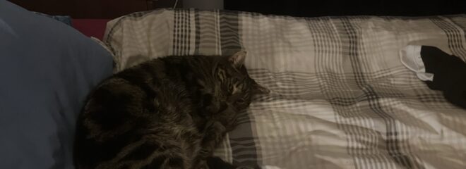 Saphy making herself comfortable ready for a good night’s sleep. Little does she know she is not getting one because that is my pillow she is on. In about 90 seconds she is getting relegated to the foot of the bed. Amber is in the room but not in the photo as she is in the crawlspace between the bed and the matress.