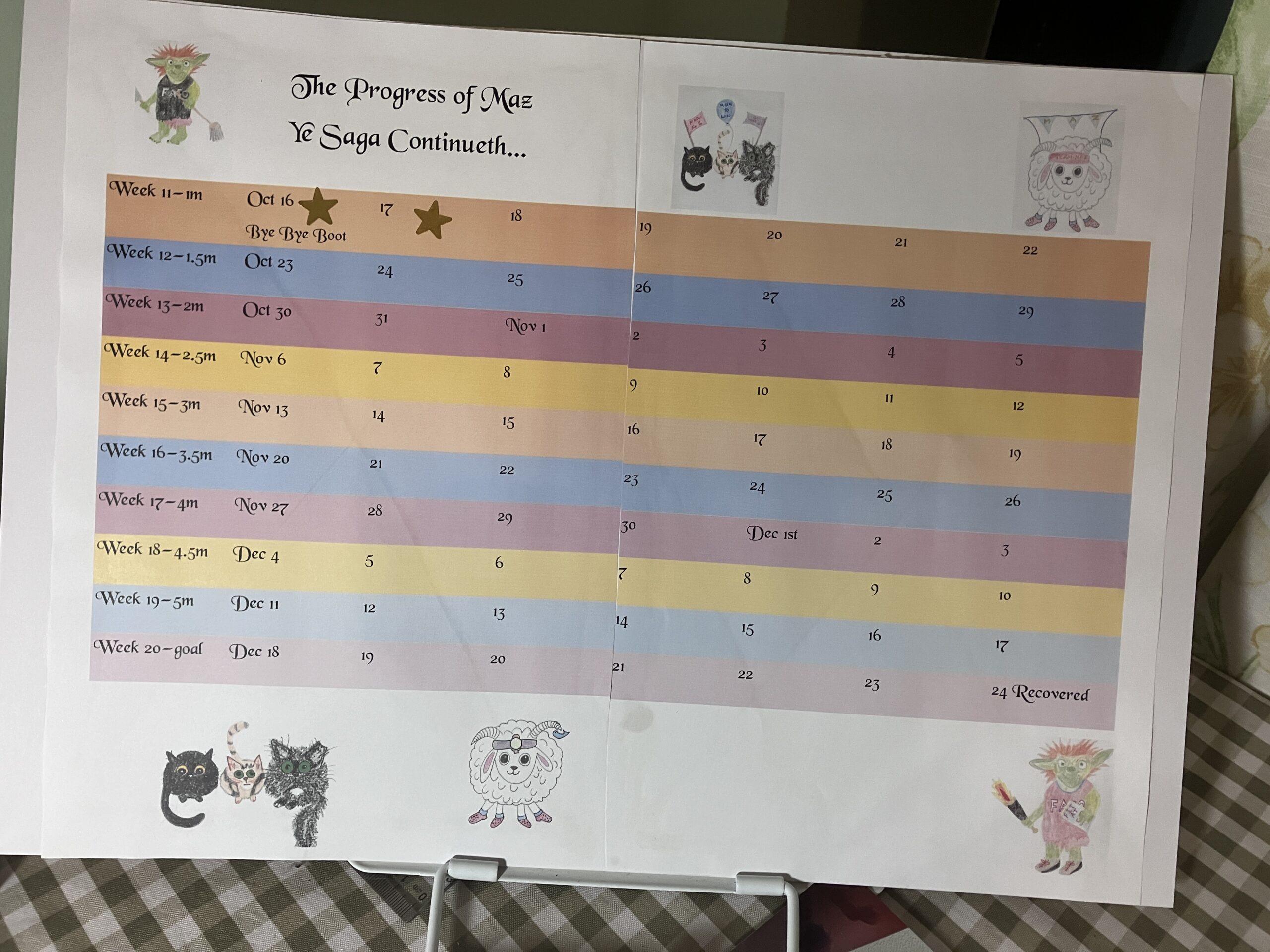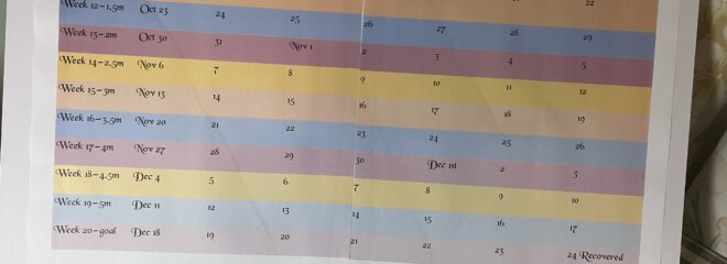 So this is my new chart. Starting with this week at one mile – I need to build by half a mile a week to make five miles by Christmas. This is approximately to Inverlounin House and back.