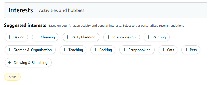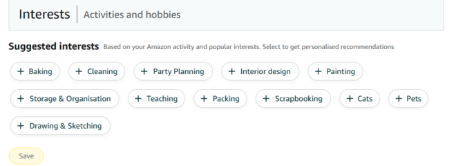 Yesterday I had cause to edit my profile (to tell it that since my foot operations I am a size 6 shoe not a 5). I noticed that they have a profile for my interests based on my past purchases.