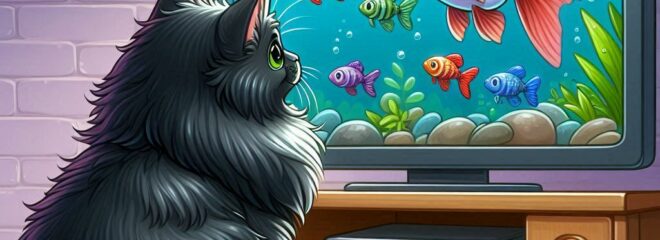 While we were watching part of the program featuring some brightly coloured fish being chased over a reef by sharks, Lucky came into the room. He was most intrigued by the images – though he didn’t know whether to be frightened of them or try to attack. Several times he crept into the room and sat there quite entranced with his big bushy tail twitching.