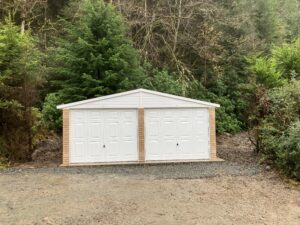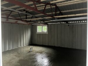 This is the outside. It is a double with one side for our car and one for Rowley the lawnmower, bikes and all our powertools. We are getting a proper workbench with a vice and power strip.