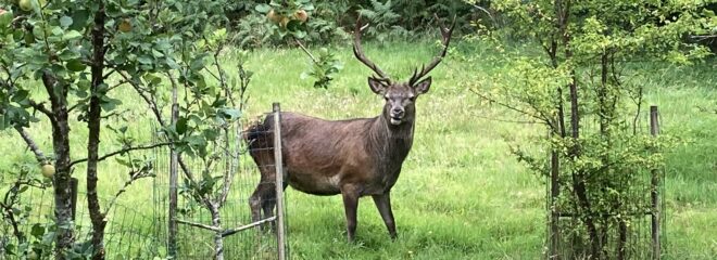 So the next time we see one of these gentlemen in our garden he had better watch out or he will end up in the freezer before you can say “fruit tree”. The picture is of a stag in our garden two years ago, and yes, he did destroy several fruit trees.