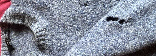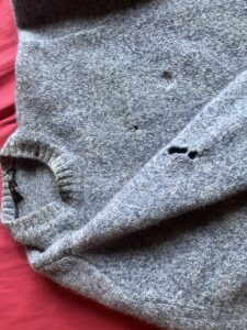 J turned up here in a jumper with a hole in it, a stain down the front, and a logo which had so disappeared into the fabric that it looked like another stain. Bear in mind that J is moderately wealthy – a new jumper is not in any way beyond his means. So I said I would wash it for him, and I did – but when I took it out, I realized that the hole had a few friends. It looks as though moths have got into it. Hard luck J – it is beyond your reach and is going in the bin.