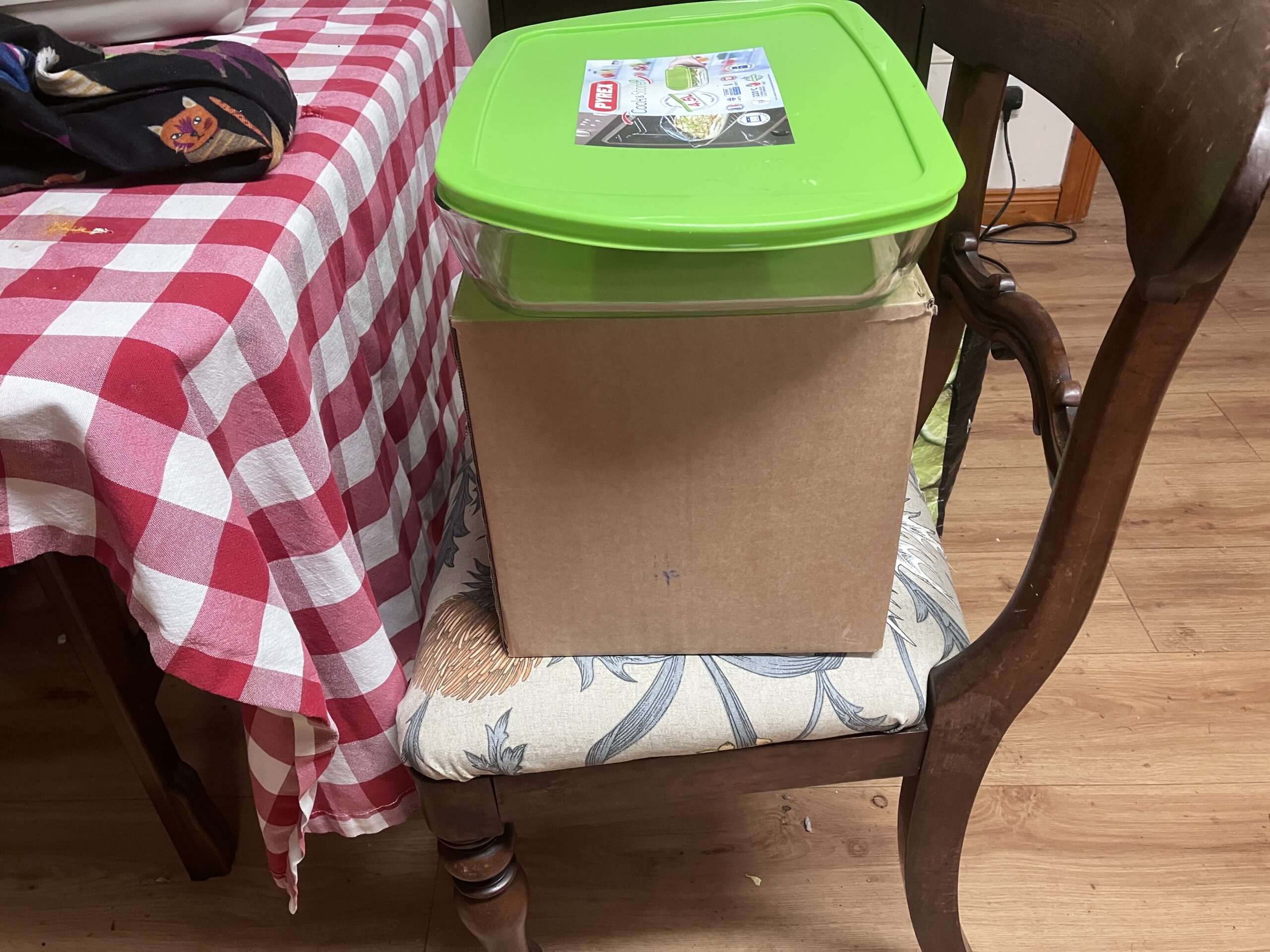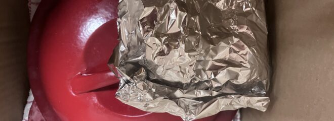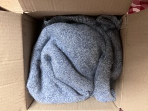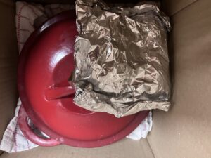 Then in a fit of brilliant inspiration, I used J’s old jumper to swaddle the pot. I packed the whole thing in a box with towels all around it, closed the lid and put a weight on top of it. This is called “hay box cooking” because people used to use hay for the packing. It was very popular during WWII when fuel was in short supply.