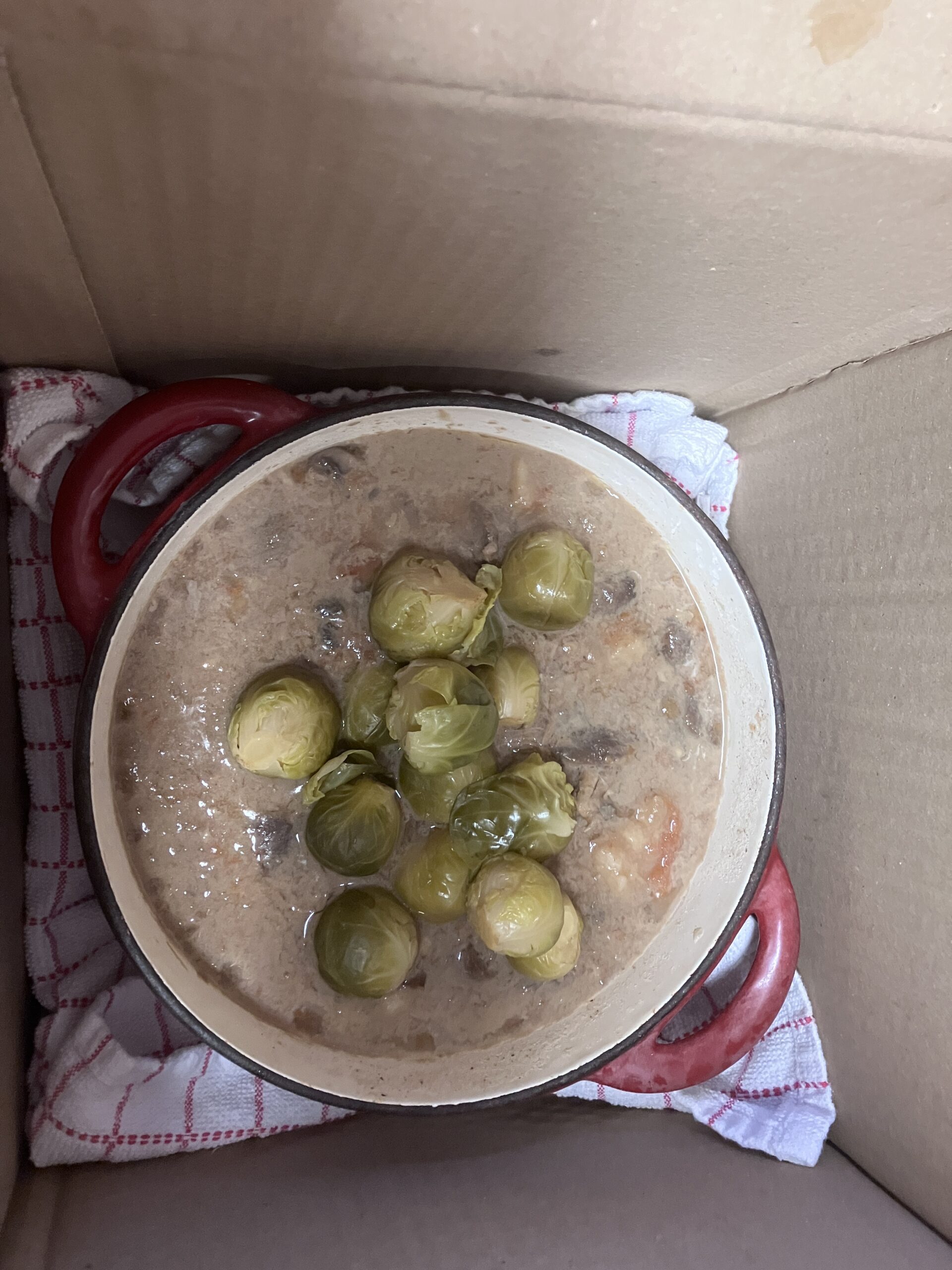 Six hours later I opened the box and took out the casserole. In theory, it should have gone on cooking and still been very hot, but in practice it had cooled down a lot. I think either I had not heated the pot enough – or left it too long because R found it tolerably hot but I thought it was a bit lukewarm.