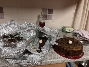 So this year I baked a vegan one for Rory’s sister and two half size ones as “Christmas Logs” – one for J and one for my Mum. With the logs, I had the idea of baking them with a layer of marzipan in the middle, like a simnel cake. I’ve been feeding them with whisky every week since October.