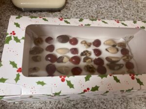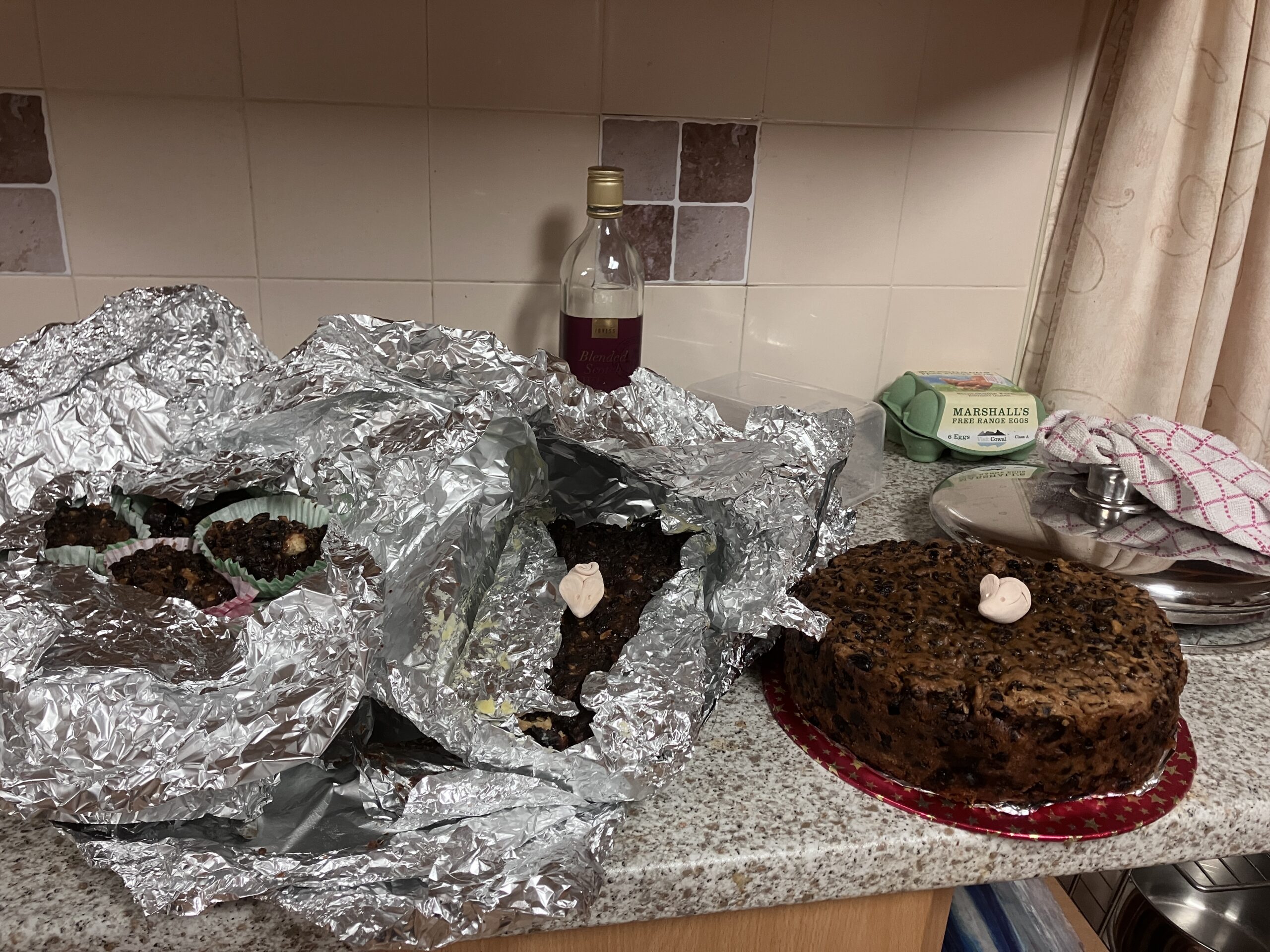This was my cake baking production line with the finished article on the right. I decorated them with fruit and nuts rather than putting bits of plastic crap on them.