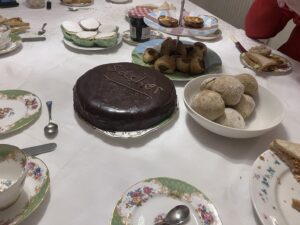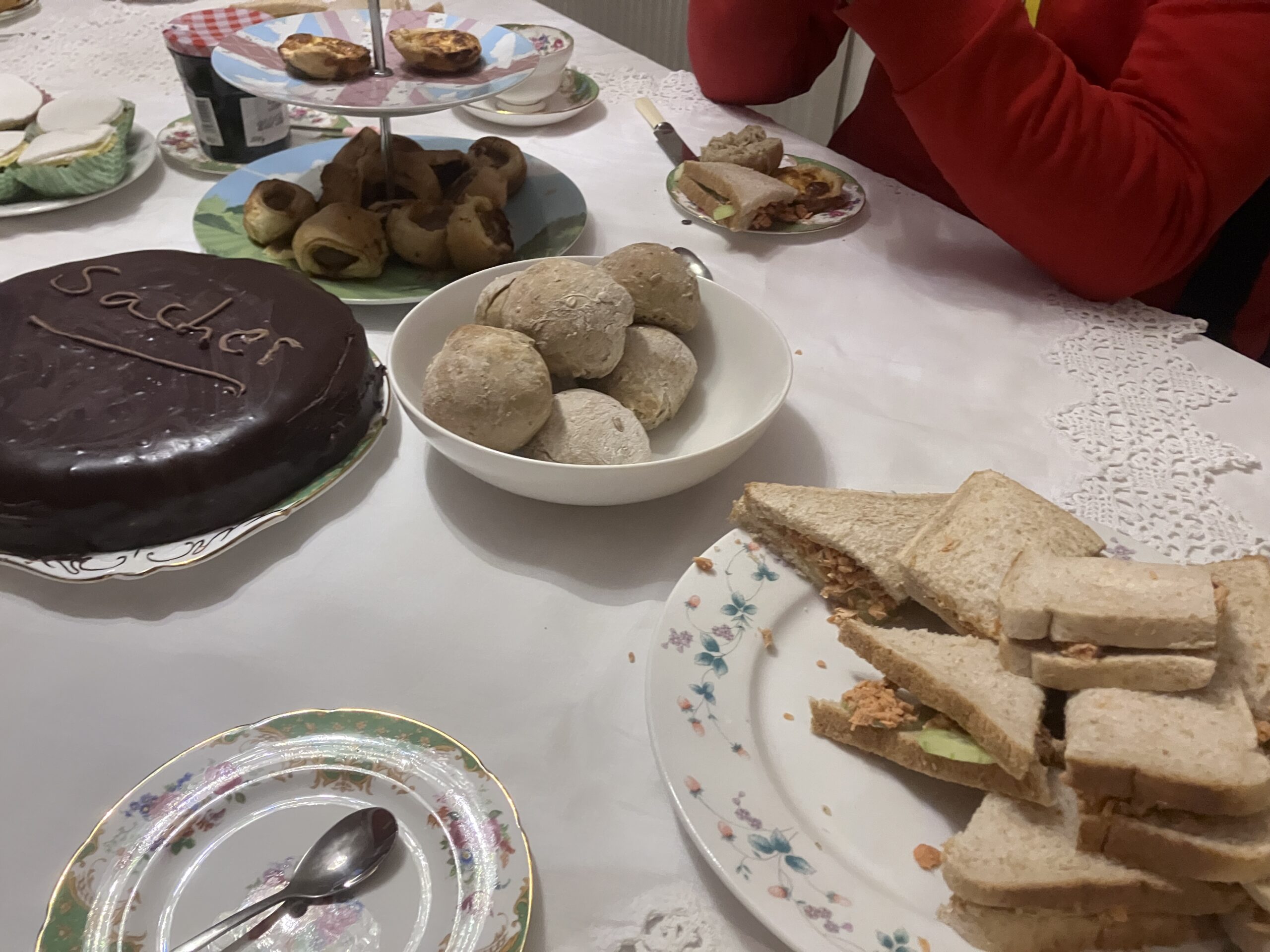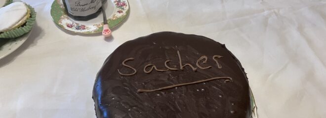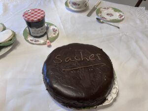 In the afternoon I made afternoon tea with my mother’s wedding china. We had salmon sandwiches, sausage rolls, scones with cream and jam, and specially for R, Sachertorte. This was the cake he stubbornly refused to try when he was in Vienna, but he could not escape me, and today I inflicted it on him in all its “million calorie a slice” glory.