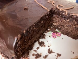 It is actually a lovely cake, and rather to my taste as (being made with dark chocolate) it is not that sweet. It is a bit of a hassle to make though, and I am not sure to be honest that R would not just have preferred an ordinary chocolate cake. But I enjoyed making it.
