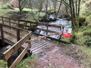 To my certain knowledge there is nothing wrong with the bridge because I just stepped over it and walked across. That sign has been there for at least the last six months and it is a crying disgrace as either the National Park or the Forestry Commission have a duty of care to either a) keep it in repair if it actually needs it or b) remove the signs if no longer needed. About what I would expect from past performance to be honest.