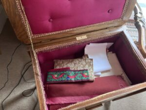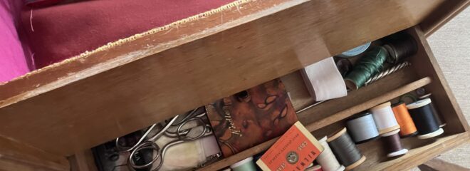 There are button hooks, rug hooks, a huge collection of buttons and beads, embroidery threads in a variety of colours. There was also darning wool and a “mushroom”. Does anyone darn any more? I certainly don’t although I do know how and have used the technique, not for socks but to repair knitware.
