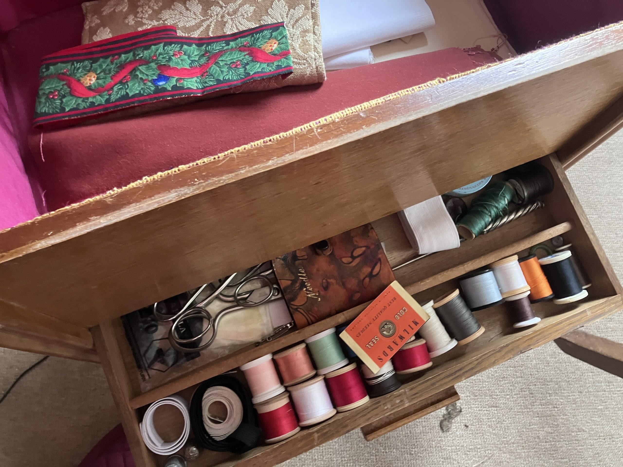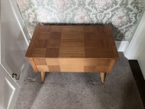 For some reason there are three separate sewing tables in the house – one Victorian walnut which J took himself, and two others which are 1960s/70s but are stuffed with old things.