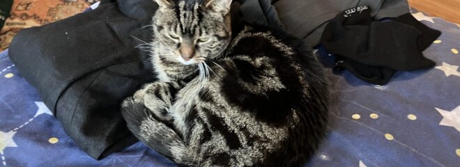 When I got home, I unpacked my one and only suit (which I wore to J’s Mum’s funeral back in June). Within 10 minutes Saphy was sleeping on it, and has been there most of the day.